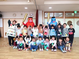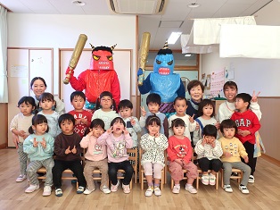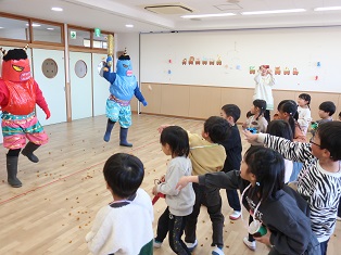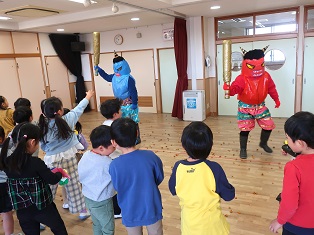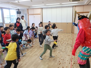 2026/2/4 節分 2月3日節分の豆まきを行いました。急に現れた鬼に子ども達は驚き、怖がる様子もありましたが、「鬼は~外!福は~内 !」大きな声で元気いっぱい豆を投げて、みんなで力を合わせて鬼を追い払いました。 投稿ナビゲーション 交通安全教室